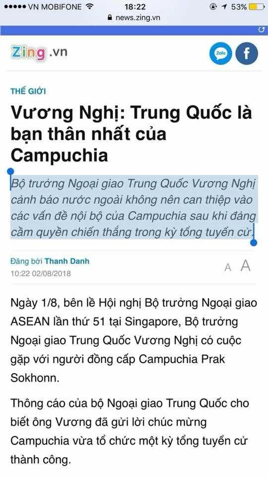 Đảng anh tuyên bố không cho nước ngoài can thiệp vào chuyện nội bộ Campuchia vì Trung Quốc là “bạn thân nhất” của Campuchia. Không biết đảng...