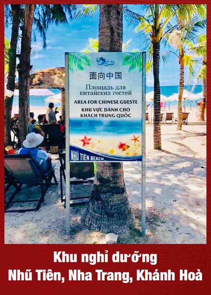 Trên bảng này thì ngôn ngữ Trung Quốc được ưu tiên nhất, đến tiếng Nga, đến tiếng Anh. Và cuối cùng là một câu tiếng Việt lạnh lùng, khinh rẻ, coi thường, tống cổ người dân Việt chúng ta ra khỏi lãnh thổ nơi mà họ đang sống. Nơi mà người Việt chúng được thể hiện quyền tự do theo đúng pháp luật và hiến pháp quy định. Thế nhưng tại nơi này người Việt đã bị tước đi cái quyền cơ bản nhất, đó là quyền đi lại, quyền được tắm, được ngồi, được nhìn cảnh quê hương.