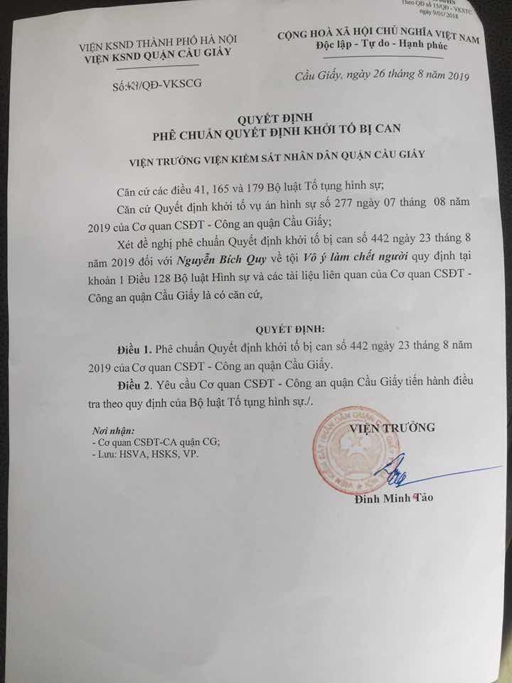 BÀ QUY CHÍNH THỨC ĐƯỢC NHẬN QĐ KHỞI TỐ BỊ CAN