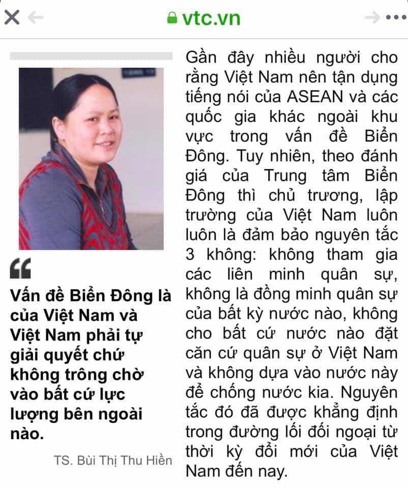 Đây là phát ngôn của TS Bùi Thị Thu Hiền - phó GĐ trung tâm nghiên cứu biển Đông - viện nghiên cứu Trung Quốc và cũng là một điềm báo cho hoạ mất nước đang đến gần nếu như nhà cầm quyền Việt Nam cùng chung một quan điểm đó!