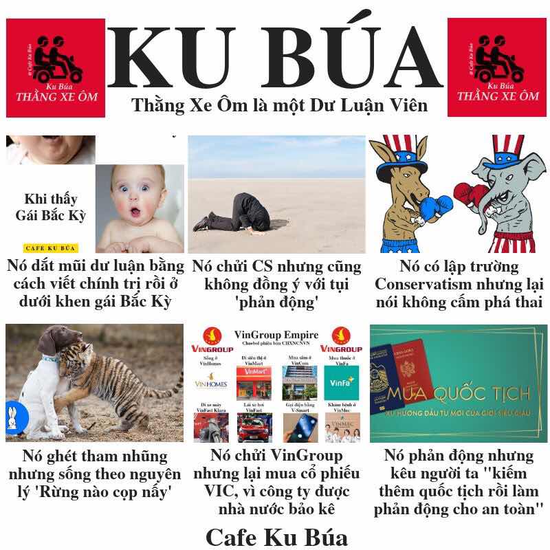 2. Ku Búa vừa chỉ trích chính quyền CS nhưng cũng không đồng tình với ‘phản động’ vì theo nó họ chỉ chửi và chửi. Vậy tóm lại nó có lập trường gì, chẳng có gì. Nó là thằng ba phải đúng nghĩa.