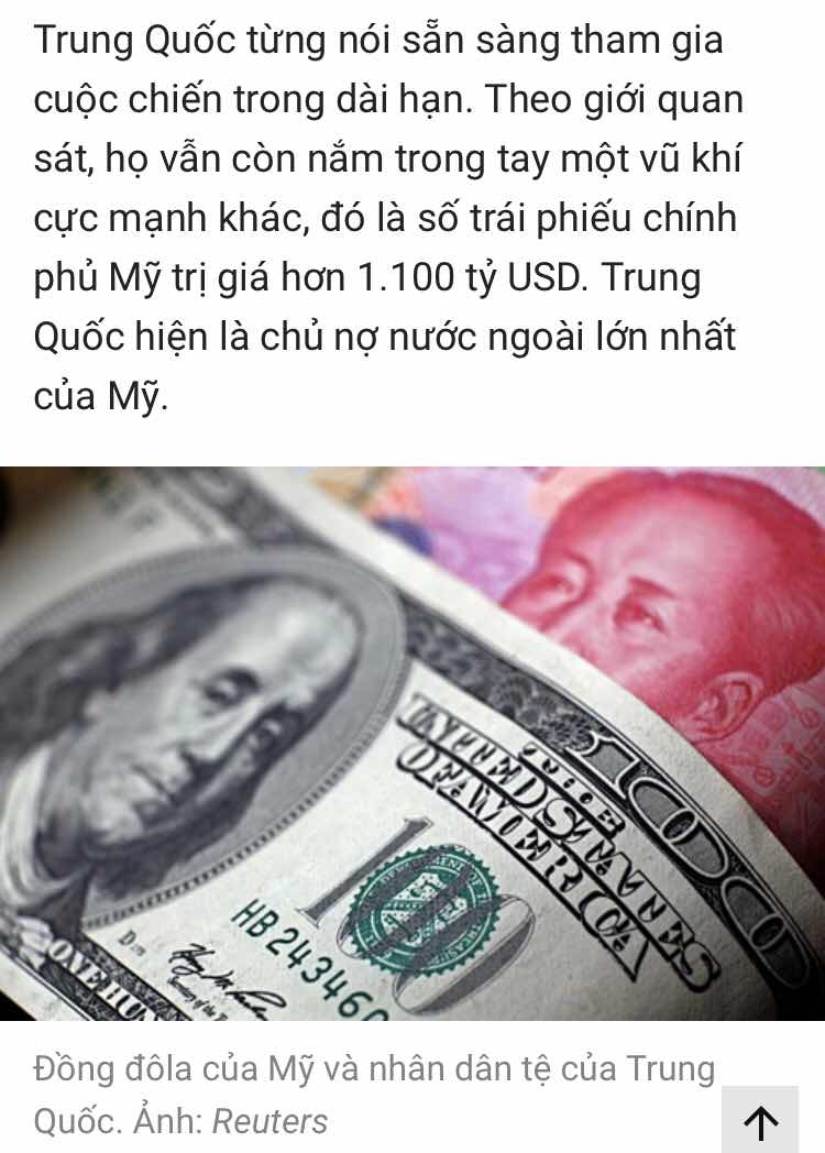 (*) Nhật mới là chủ nợ tác động mạnh tới đồng USD của Mỹ. Nhật luôn nắm giữ trái phiếu kho bạc Mỹ sát nút TQ, chính vì đó đồng Japanese yen, hay JPY mới là đồng tiền an toàn nhất, và Nhật cũng là cường quốc xuất khẩu cực lớn hàng đầu thế giới với hàng hóa có phẩm chất cao độ rất được thế giới ưa chuộng thì nếu TQ bán trái phiếu kho bạc Mỹ thì họ sẽ không thể giữ được tỷ giá đồng CNY cạnh tranh, trong khi Nhật sẽ là đối thủ nặng ký giữ trái phiếu kho bạc bằng tiền Mỹ để có thể điều chỉnh đồng JPY đắt hay rẻ để tung đòn đá văng giành hết hàng hóa xuất khẩu của TQ ở các thị trường chủ lực như Âu châu, Mỹ, Bắc Mỹ,....Cần biết rằng, bất cứ khi nào Nhật bán tài sản niêm yết bằng đồng JPY thì đều được các thị trường quốc tế mua sạch chứ TQ thì nước ngoài nó bỏ chạy.