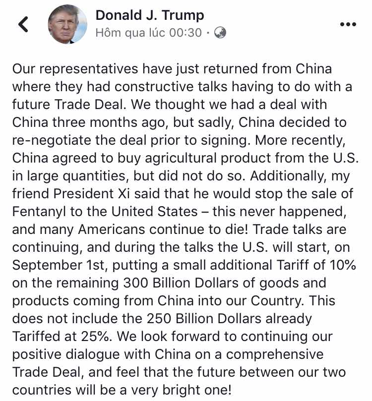 TRUM LẠI SAI ? Sau cái twett thông báo đánh thuế tiếp lên 300 tỷ hàng Trung cộng, thị trường chứng khoán đỏ rực, đã thế phía bên kia lại hạ ...