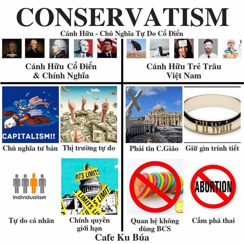 Những thứ đó liên quan gì? Khái niệm Cánh Tả (Liberalism) và Cánh Hữu (Conservatism) chỉ dành để phân biệt chính sách kinh tế và chính trị. Còn những thứ khác như yêu ai, giới tính bạn là gì, bạn tin vào tôn giáo nào, bạn ủng hộ hay phản đối phá thai, bạn có dùng BCS hay không, bạn ủng hộ cá nhân nào - đó đều là quan điểm cá nhân và chỉ dừng lại ở mức quan điểm.