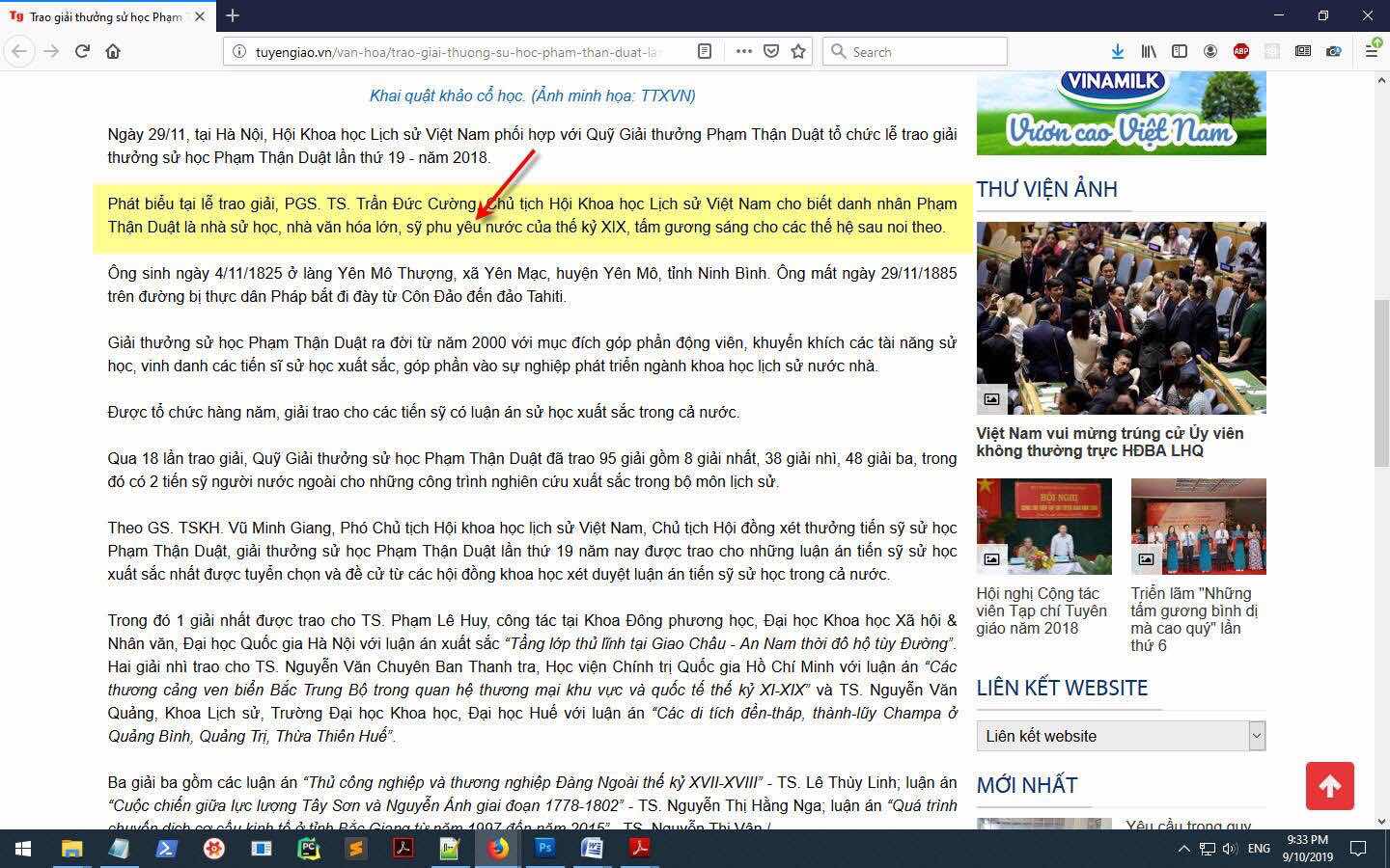 Yup, bạn cứ thoải mái lên tiếng về vụ này. Vì xem ra, kỳ trước ở miền Trung, người ta cũng đánh bóng quá trời cho ngài Đỗ Thúc Tịnh nào đó, là nhà yêu nước. Tới khi mình đọc Đại Nam Thực Lục, thì hóa ra, ngài Đỗ Thúc Tịnh này là một vị quan giỏi, và chưa hề có gì nổi bật trong vụ chống Pháp cả. Ấy thế mà các thầy khen bựa lên là ngài họ Đỗ này là nhà yêu nước lớn của dân tộc cơ đấy. Một sĩ phu yêu nước chắc phải có nhiều hoạt động nào đó thuộc dạng "yêu nước", chứ không thể nào là một vị quan đã ký hiệp ước bán nước, rồi sau đó bị người Pháp bắt, và người ta lại khen tung lên là "một sĩ phu yêu nước", như thầy PGS TS Trần Đức Cường đã khen ngợi như thế trong bài viết này (xem >> http://tuyengiao.vn/van-hoa/trao-giai-thuong-su-hoc-pham-than-duat-lan-thu-19-nam-2018-116972) đâu đúng không bạn ?