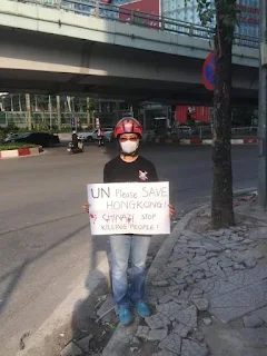 Ảnh : sáng nay, một người dân Việt Nam đã đến cạnh toà nhà của UN tại Hà Nội để kêu gọi Liên Hợp Quốc quan tâm và cứu giúp những người dân Hong kong vô tội !