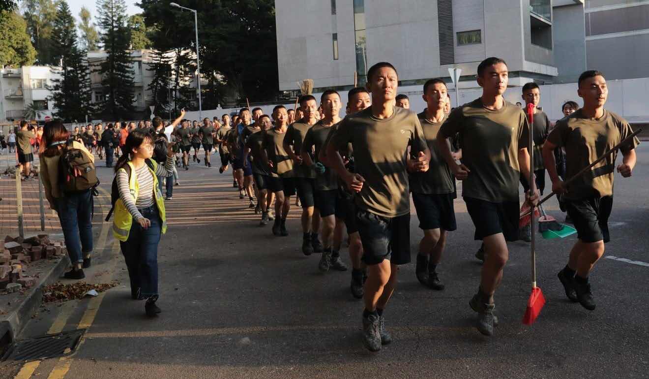 Những người lính PLA - không phải với vũ khí mà là xô và chổi, không phải quân phục mà là áo phông và quần sort - để hỗ trợ người dân Hồng Kông dọn dẹp rào chắn và khôi phục giao thông , như sau đó quân đồn trú đã nêu trong blog chính thức của nó.