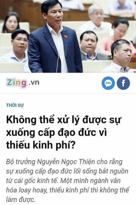 Vâng! Ông bộ trưởng Nguyễn Ngọc Thiện nhận định rất đúng! Ông nói rằng: " Đạo đức xuống cấp xuất phát từ kinh tế". Và ông cũng than thở: "không thể xử lý được sự xuống cấp của đạo đức vì thiếu kinh phí"!