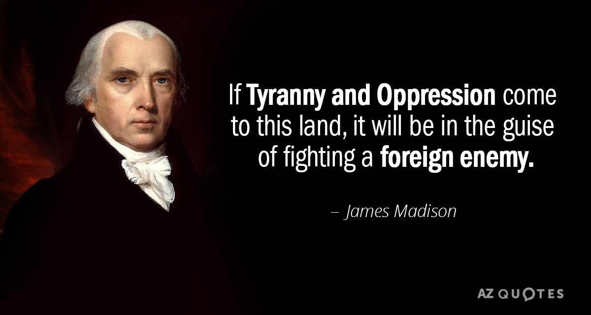 Và đây, mời các bạn đọc luôn câu nói nổi tiếng của TT Mỹ James Madison "If Tyranny and Oppression come to this land, it will be in the guise of fighting a foreign enemy.", bạn có hiểu là gì không ? Nếu không, sao bạn không hỏi các nhà dân chủ nổi tiếng của bạn ? Yup, cả 200 năm trước, người Mỹ đã biết như vậy rồi đó bạn, và con nít Mỹ đi học thời trung học hay sinh viên, ai cũng biết câu này khi bàn về Quốc Gia. Chắc các nhà dân chủ của bạn chưa hề đọc câu này đâu đúng không ? Có khi họ còn chưa bao giờ đọc thông Anh ngữ cả ? Bạn có thể đi hỏi họ tại sao Brian lại đưa ra câu trích đoạn này làm gì, vì có khi đó là hình ảnh của bạn trong đầu mình đấy.