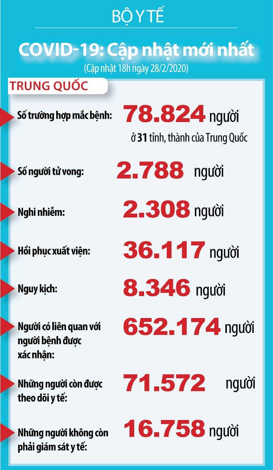 - Theo báo cáo của hệ thống giám sát bệnh truyền nhiễm cập nhật đến 19h ngày 28/2, thế giới ghi nhận 83.715 người nhiễm bệnh viêm đường hô hấp cấp (Covid-19) tại 57 quốc gia và vùng lãnh thổ. Số ca tử vong lên tới 2.859.