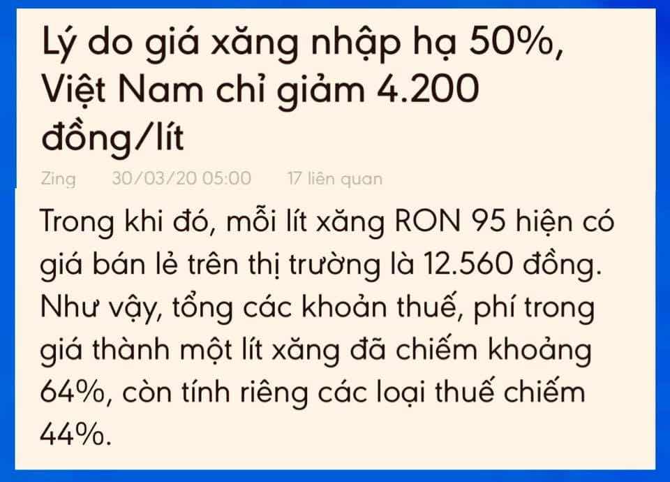 Riêng tiền của các loại thuế phí trên của một lít xăng lên đến 8,031 đồng. Thuế phí chiếm đến 64% cấu thành giá xăng bán lẻ. Nên dù 1 lít xăng RON 95 nhập về giá 3,827 đồng/ lít nhưng giá bán cho dân là 12,560 đồng/ lít. (Nguồn thuế và phí, news.zing.vn, baomoi.com).