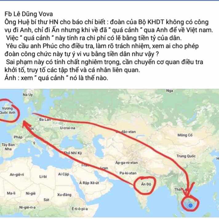 Vậy thì tại sao Lê Dũng Vo Va lại nói: Ông Huệ bí thư HN cho báo chí biết: Đoàn của Bộ KHDT không có công vụ đi Anh, chỉ đi Ấn nhưng khi về đã "quá cảnh" qua Anh để về Việt Nam. Việc "quá cảnh" này tính ra chi phí có lẽ bằng tiền tỷ của dân. Yêu cầu anh Phúc cho điều tra, làm rõ trách nhiệm, xem ai cho phép đoàn công chức này vi vu bằng tiền dân như vậy. Xin ngừng trích.