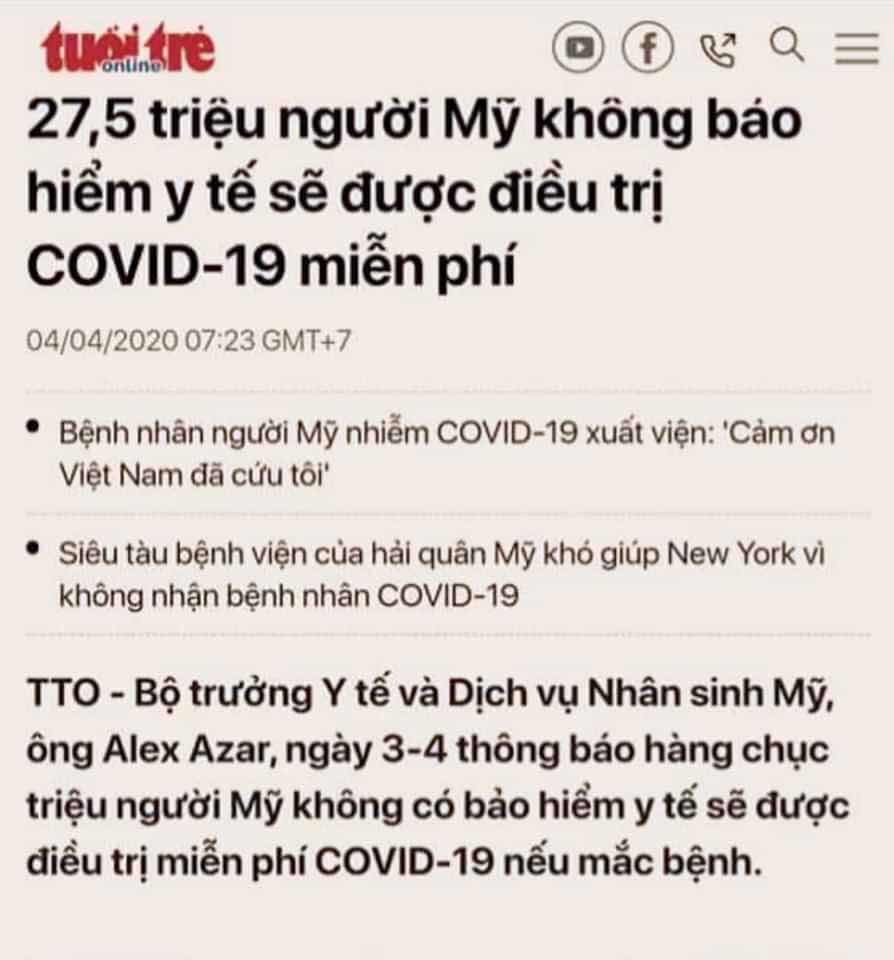 Không chỉ vậy, hôm qua cũng có báo xứ ta đăng rằng, nếu nhiễm vi rút Vũ Hán thì chỉ tiền điều trị cũng đã có thể khiến bệnh nhân tán gia bại sản. Nhưng thực tế có phải là như vậy? Hãy nhìn vào bài báo dưới đây về chính sách miễn phí hoàn toàn việc chữa trị của nước Mỹ dành cho tất cả những người có mặt trên lãnh thổ nước họ mà chưa có bảo hiểm để thấy thông tin trước đó là một sự đặt điều ác ý. Không hiểu sao một số thành phần luôn muốn tìm mọi cách để hạ nhục nước Mỹ trước dư luận với một dụng ý chẳng tốt đẹp gì?