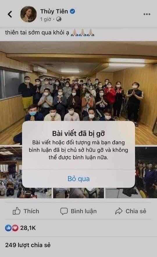 Bị dư luận phản đối cô Tiên liền xóa status nhưng lại quên báo cho tăng đỏ Thích Tâm Trí ở bên Nhựt Bổn, Vẹm cái Thích Tâm Trí gởi lời cảm ơn cô Tiên, vậy là bể mánh.