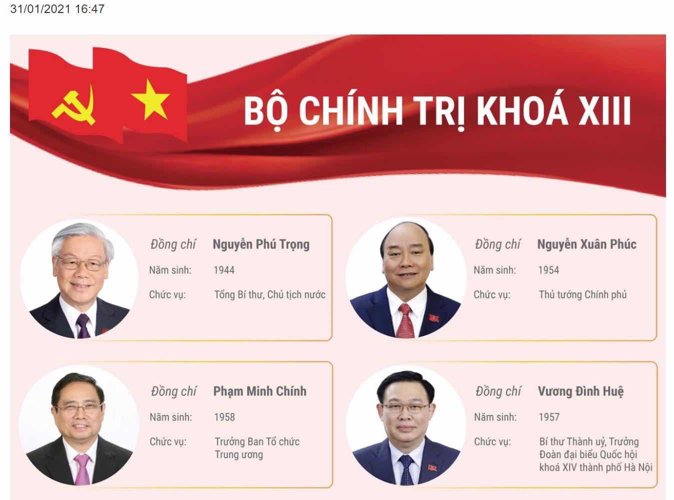 Lần này, Đại hội Đảng công bố danh sách 4 cán bộ lãnh đạo chủ chốt (dân quen gọi là "tứ trụ") rất rành mạch trong Danh sách Bộ chính trị.