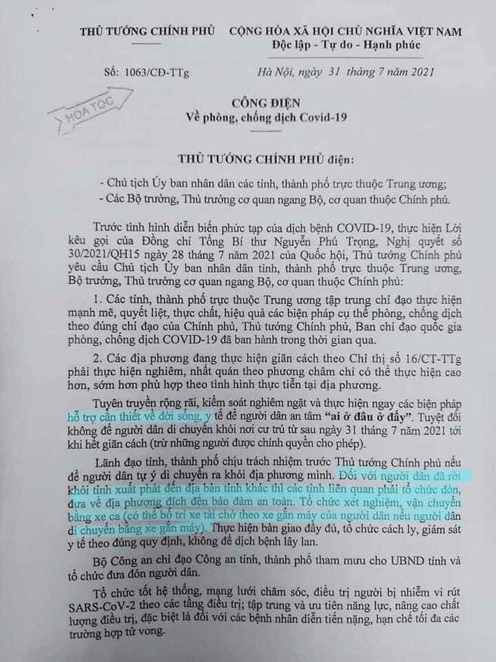 Chủ trương của lãnh đạo Bình Định cũng trái với công điện số 1063 của Thủ tướng chính phủ. Công điện số 1063 do Thủ tướng ký ngày 31/7 có đoạn chỉ đạo việc các địa phương phải tiếp đón, đón nhận người dân “tự phát” trở về quê: “Đối với người dân đã rời khỏi tỉnh xuất phát đến địa bàn tỉnh khác thì các tỉnh liên quan phải tổ chức tiếp đón, đưa về địa phương đích đến bảo đảm an toàn. Tổ chức xét nghiệm, vận chuyển bằng xe ca (có thể bố trí xe tải chở theo xe gắn máy của người dân nếu người dân đi xe gắn máy), thực hiện bàn giao đầy đủ, tổ chức cách ly, giám sát y tế theo đúng quy định...”