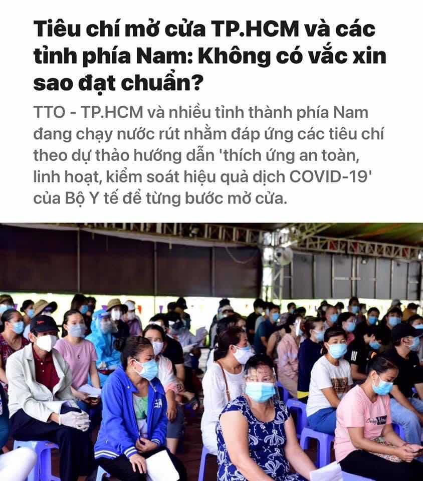 Tiêu chí mở cửa thành phố. và các tỉnh phía Nam là đạt một số tiêu chí của Bộ Y tế. Trong đó có yếu tố vaccine. Thế nhưng cho đến nay không có đủ vaccine thì sao đạt chuẩn? Bắt chiến đấu mà không cung cấp đủ súng đạn thì làm sao thắng. Đưa tiêu chuẩn mà không phân bổ cho đủ vaccine thì làm sao? Chích nước cất à? Hay là phải chọn Sinopharm hay vaccine CuBa. Dân đang mong được chích cho đủ hai mũi để bớt lo nhưng kiểu này chắc còn lâu. Mà vaccine còn lâu thì chuyện mở cho hết cửa cũng còn lâu.